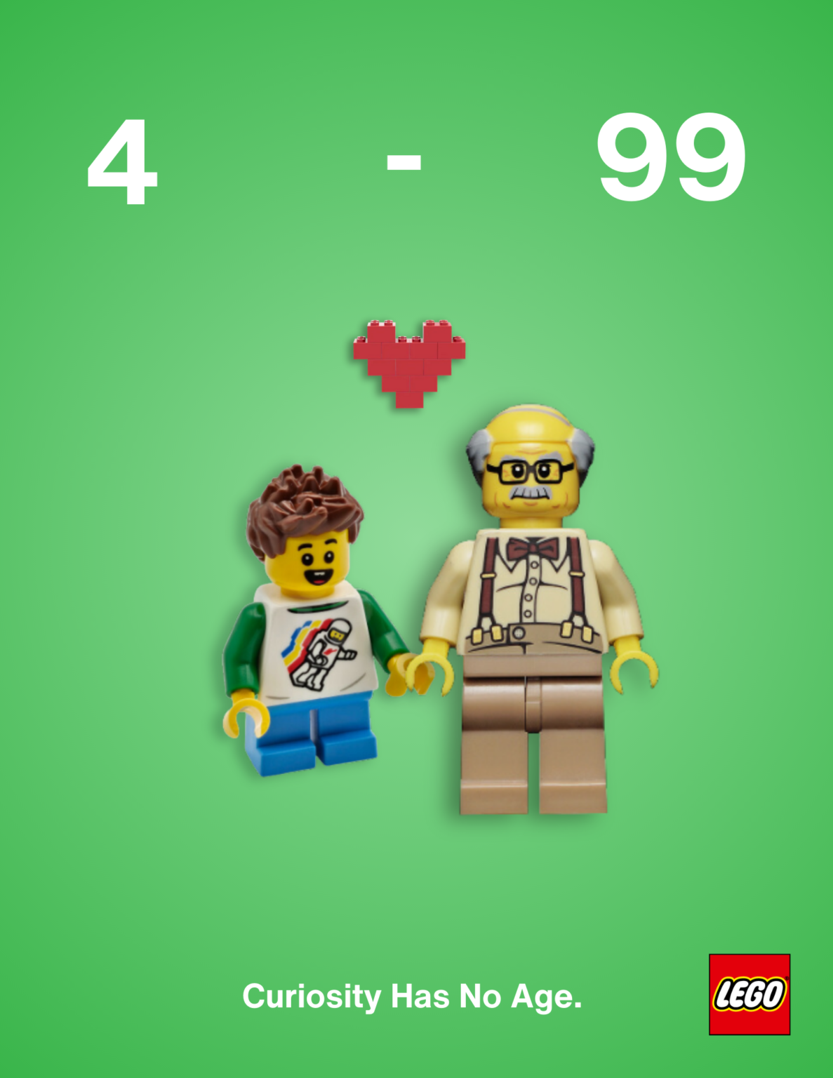 Just some fun print ads inspired by the recommended age on lego boxes. Legos harness the power of connection and remind us that we all can lego!